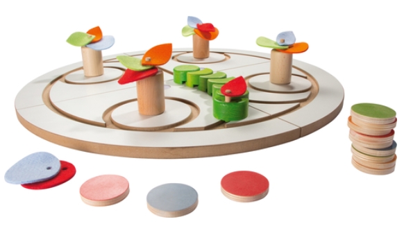Die kleine Raupe macht sich auf den Weg, um eines Tages ein wunderschöner Schmetterling zu werden. Damit sie schnell wächst, muss sie möglichst viele Blätter und Früchte fressen. Das Ziel ist es, gemeinsam die Raupe in einen Schmetterling zu verwandeln. Das Spiel hat durch seine Vielseitigkeit einen hohen pädagogischen, didaktischen und ästhetischen Wert. Durch seine aufsteigenden Schwierigkeitsstufen ist es für Kinder ab 2 Jahre, aber auch genauso für ältere Kinder geeignet. Die Führung der Raupe im Spielbrett fördert die fein-und graphomotorischen Fähigkeiten. Die Filzteile symbolisieren unterschiedliche Früchte je nach Fantasie der Spieler. Darüber hinaus fördert das Spiel erstes Regelverständnis, Hand-Auge-Koordination, Konzentration sowie Farb-und Formdifferenzierung. Für 1-4 Spieler.