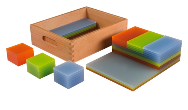 Insgesamt 49 Platten im Uhl-Holzkasten (30 x 23 x 8,5 cm): 6 Platten 66,6 x 266,6 x 7 mm (je 2 Platten in hellblau/ hellgrün/ orange) 12 Platten 66,6 x 133,3 x 7 mm (je 4 Platten in hellblau/ hellgrün/ orange) 24 Platten 66,6 x 66,6 x 7 mm (je 8 Platten in hellblau/ hellgrün/ orange) 4 Platten 200 x 133,3 x 7 mm (2 Platten/ hellgrün, 2 Platten/ hellblau) 3 Platten 200 x 266,6 x 7 mm (je eine Platte Hellblau/ hellgrün/ orange)