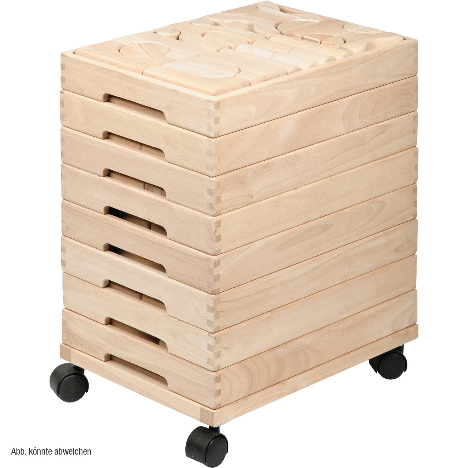 Hartholzbauklötze natur, fein geschliffen, Kanten gebrochen. Die vielen unterschiedlichen Formen ermöglichen fantasievolles Bauen. Alle Bausteine sind in 39 x 29 x 4,5 cm großen Holzkästen untergebracht. Zur Größenvorstellung: der Rundbogen ist 26,3 cm breit, Quadrat 6,6 x 6,6 cm, Holzstärke 3,3 cm.