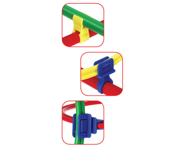 Mit diesem Set von 30 Verbindern können Sie wahlweise 10 Gymnastikstäbe mit Stangen, 10 Gymnastikstäbe mit Reifen, 10 Reifen mit Reifen verbinden.