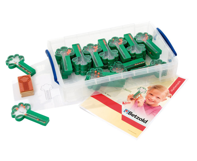 Bäumlein rüttel dich - Bäumlein schüttel dich - und schon fallen 10 reife "Äpfel" nach dem Zufallsprinzip in 2 Auffangröhren mit Skalierung. Bei jedem Schütteln verteilt sich das "Obst" neu. Alle "Erntehelfer" verstehen schnell, dass sich die Zahl 10 auf vielfältige Weise zerlegen lässt. Dank der Skalierung verbindet sich die Menge auch gleichzeitig mit einer Zahl. Das schult Mengen- und Zahlenvorstellungen. Das Erfassen der Aufgabe und die Selbstkontrolle werden durch die Skalierungen schneller und genauer. Durch einen Steckverschluss kann die Anzahl der orangen Kügelchen jederzeit verändert werden. Deshalb sind auch andere Zahlzerlegungen möglich. Schüttelbaum (12 cm hoch), mit 10 Kügelchen, aus Kunststoff Vorderseite: 1 Auffangröhre abgedeckt Rückseite: beide Röhren einsehbar
