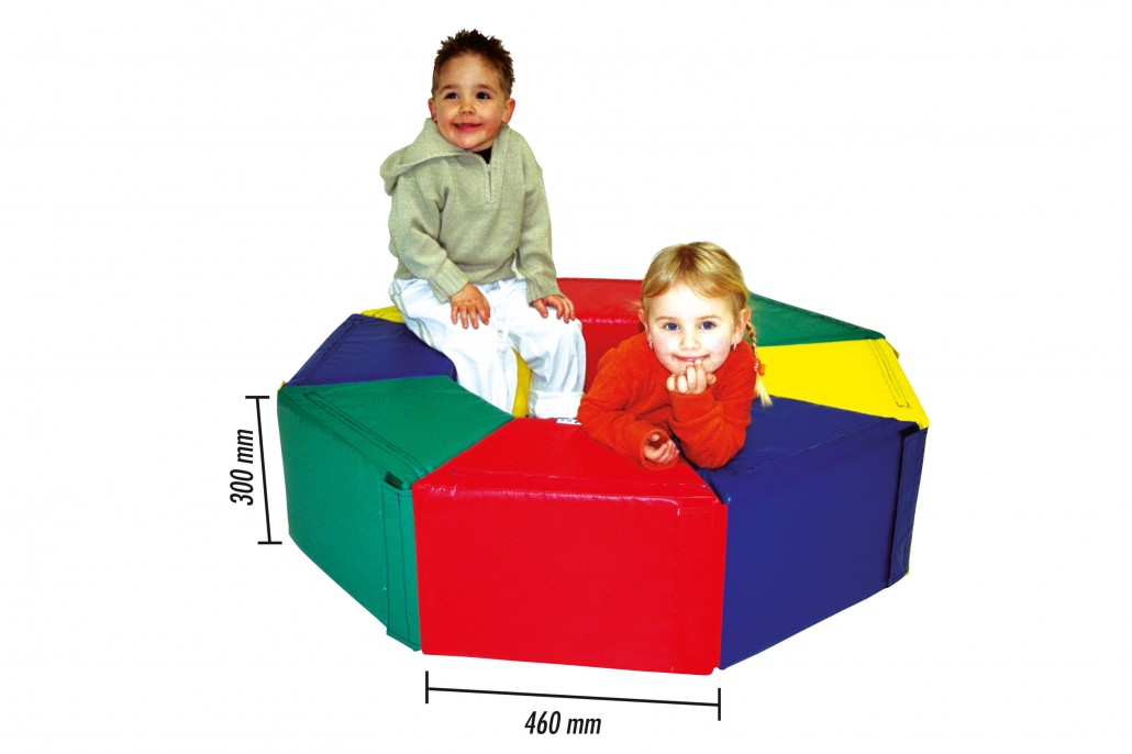 Achteckraupe bestehend aus 8 Einzelelementen, die mit Klettverbindungen zu einer Balancierraupe zusammengelegt werden können.