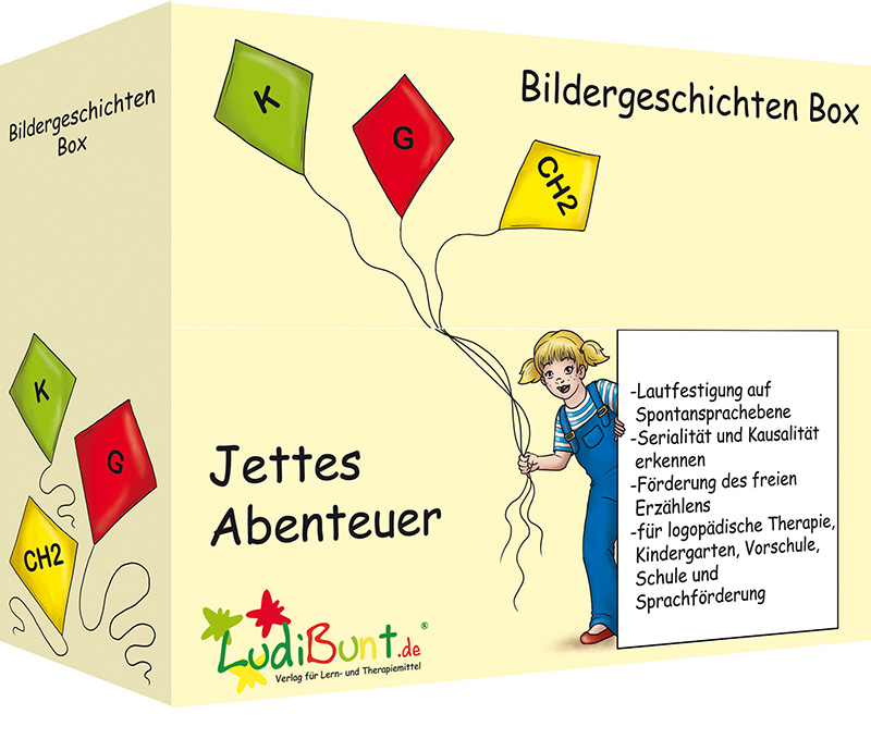 Jette ist ein freches Mädchen, das mit seiner Familie und seinen Freunden alltägliche Situationen meistert - spannende Abenteuer werden erlebt, mit Idee und Witz werden Probleme gelöst und dabei bestimmte Laute gehäuft eingebaut. Hier werden die Übungslaute "K", "G" und "CH2" gehäuft angeboten.