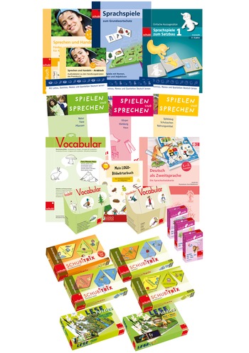 Das umfangreiche Rundum-Paket mit 35 ausgewählten Produkten zu den Schwerpunkten Wortschatztraining und Satzbildung. Die durchgängige Illustrierung der Bildkarten, Legedominos und Puzzles sorgt dafür, dass das Übungsmaterial unabhängig von den Deutschvorkenntnissen und von der Herkunftssprache eingesetzt werden kann – auch bei Kindern unterschiedlicher Altersstufen.