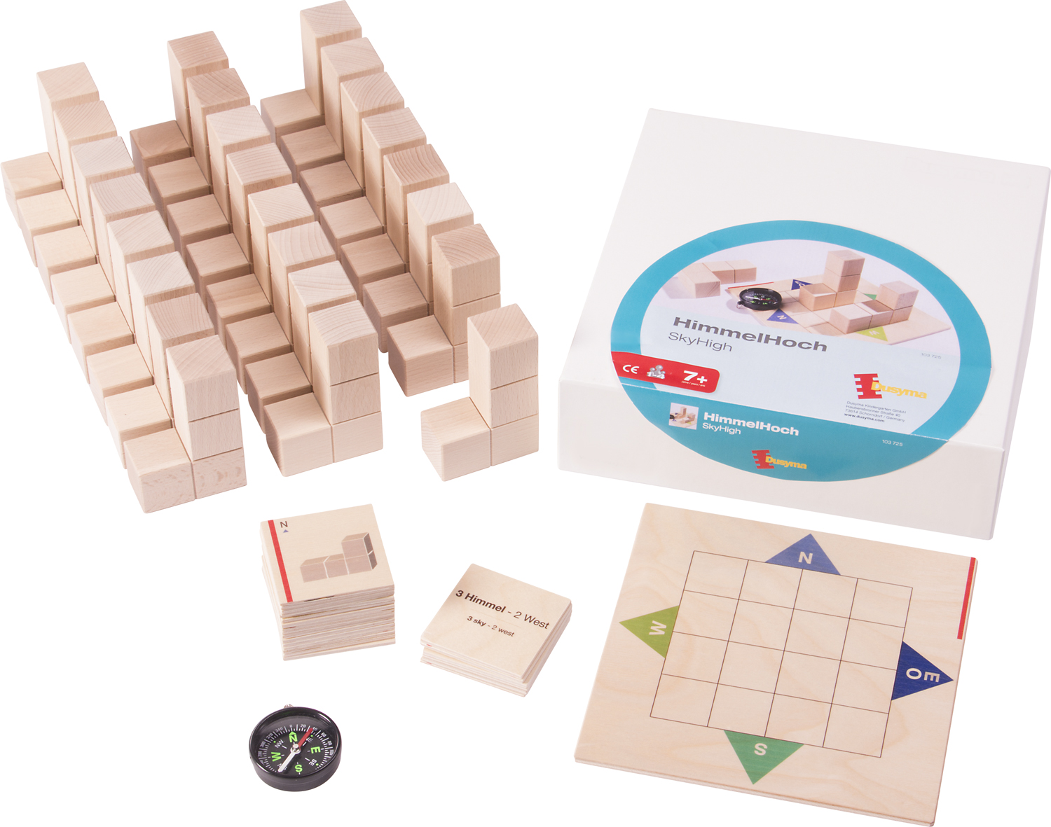 Himmelsrichtungen sind Thema in diesem Denkspiel. Auf einer quadratischen Spielfläche wird von den Spielern ein kompakter Turm aus Winkelsteinen gebaut. Dabei sind die Himmelsrichtungen zu beachten, die auf den Holzkarten angezeigt sind. Zu Beginn kann das Spielfeld zur Orientierung im Raum mit einem Kompass eingerichtet werden. Planerisches und räumliches Vorstellungsvermögen, Vorläuferkompetenzen für das Koordinatensystem und Konzentration werden gefördert