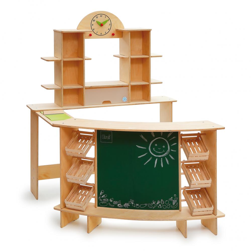 1 Kaufladenregal, 1 Verkaufstresen, 1 Verbindungsplatte, kurz, 1 Verbindungsplatte mit Fließband und Warentrenner, 6 Obststiegen, 1 Montageset, Aufkleber Tischhöhe: 63 cm Lieferung: platzsparend zerlegt
