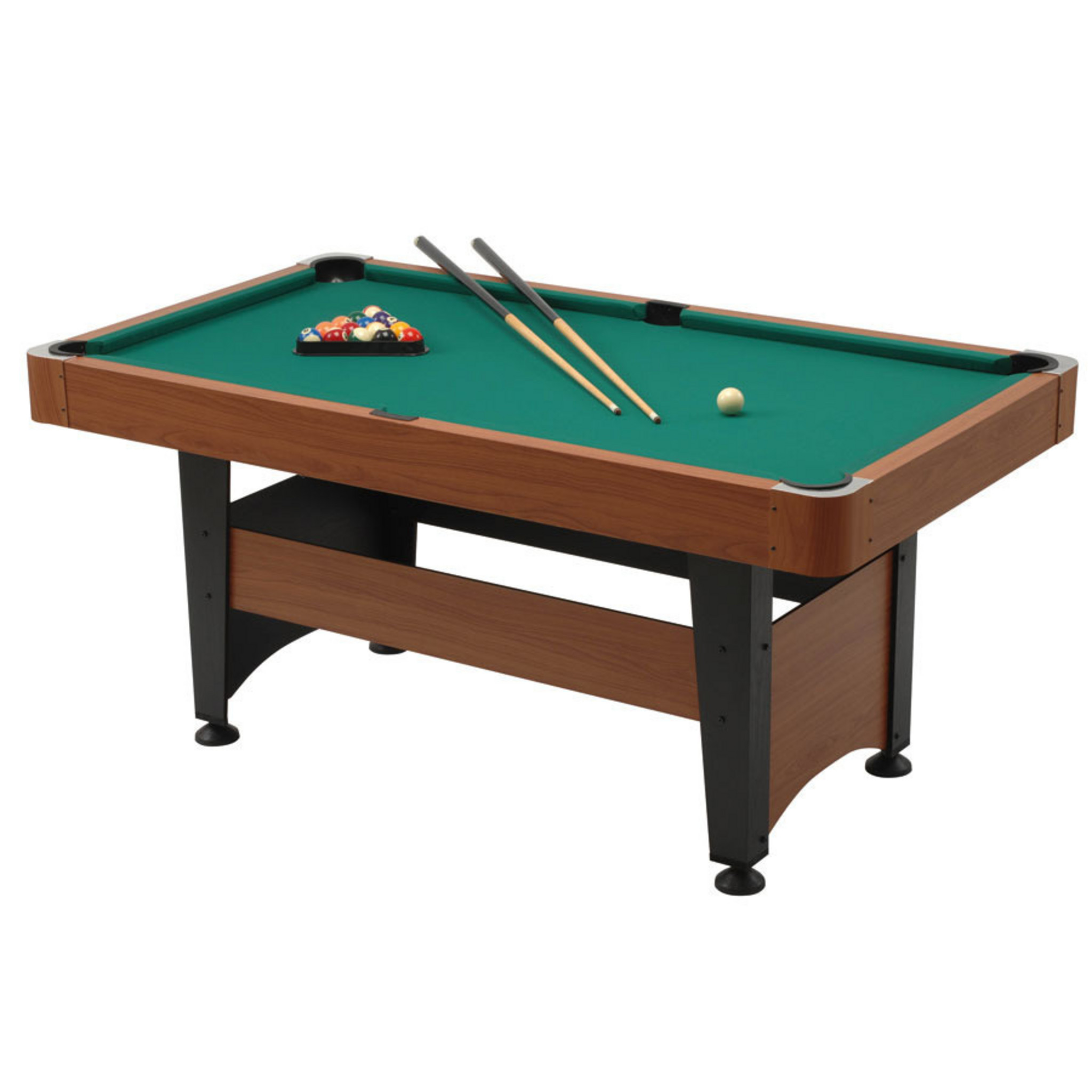 1 Billardtisch 2 Queues, 122 cm lang 1 Satz Kugeln, Ø 48 mm 1 Anspieldreieck, 2 Billardkreiden, 1 Tuchbürste Maße: Spielfläche 140 x 70 cm Außen (L x B x H): 156 x 86 x 79 cm