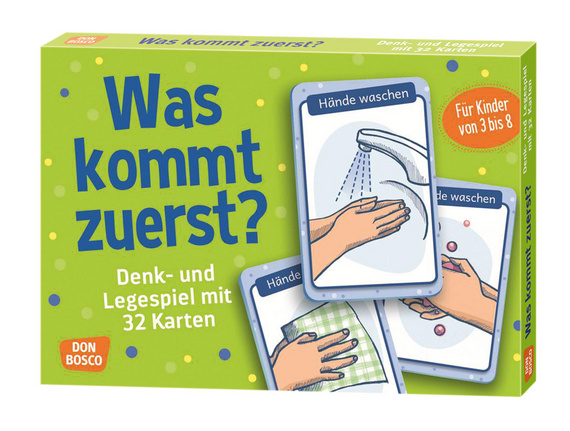 Zuerst die Schuhe anziehen, darüber die Strümpfe, dann die Jeans und zum guten Schluss die Unterwäsche? Hier stimmt doch was nicht ... Für Kinder sind Alltagshandlungen, wie etwa das Anziehen, oft noch eine große Herausforderung. Mit diesem Kartenspiel vervollständigen die Kinder Handlungsfolgen und ordnen das Geschehen in die richtige Reihenfolge ein. So erkennen sie die Teilschritte komplexer Handlungen und können sich diese besser einprägen. Acht Themen mit jeweils vier Sequenzen zu den Themen: Ankleiden, Mit-Wasserfarben-Malen, Händewaschen, Geschirrspülen, Essen, Einkaufen, Straßeüberqueren, Pflanzen. Mit Spielanleitung, Spielvarianten und methodischen Vorschlägen.