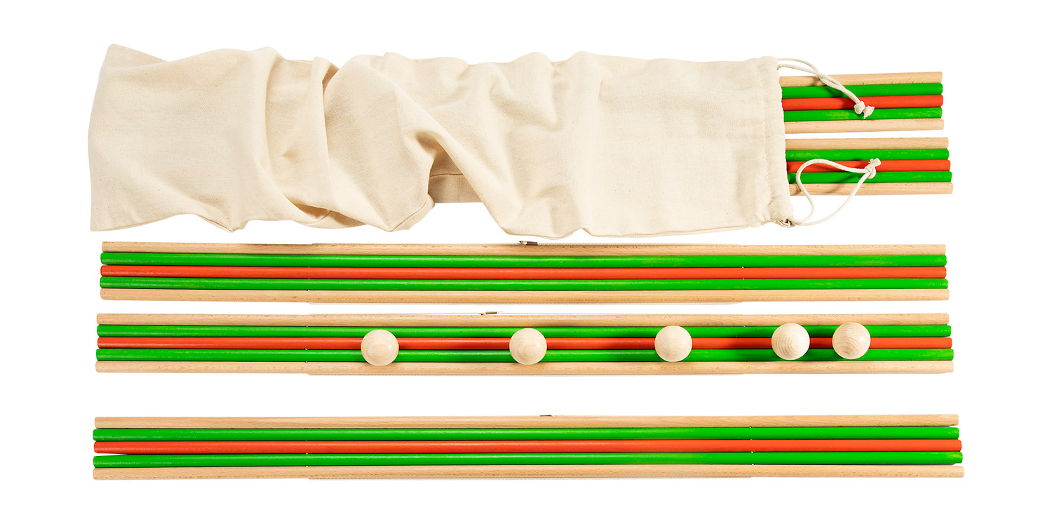 5 Rinnen aus Buche, 5 Holzkugeln, Anleitung. Maße: Kugel Ø 3 cm, Rinne 70 x 5 cm.