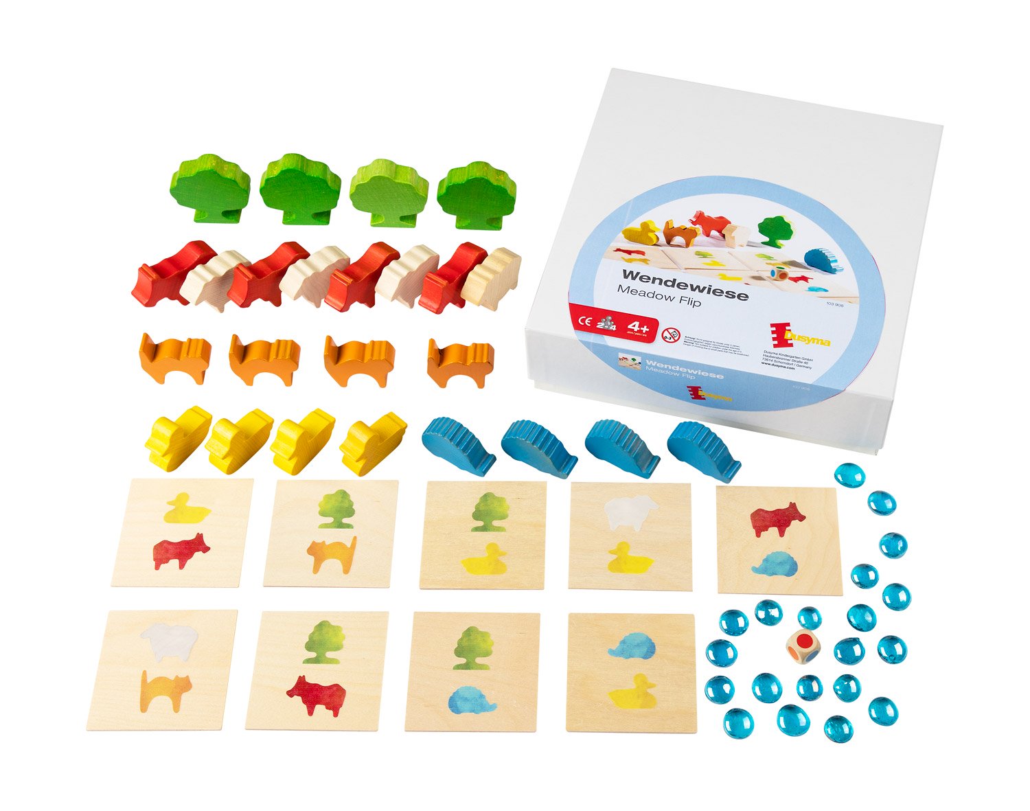 9 beidseitig bedruckte Karten aus Birkensperrholz, 24 Aufstellfiguren (je Motiv 4 Stück) aus Buche bunt gebeizt und lackiert, 20 Glasnuggets, 1 Farbwürfel und 1 Spielanleitung. Maße: Kantenlänge Holzkarte 8 cm, Kantenlänge Würfel 1,5 cm, Glasnugget ca. Ø 1,8 cm, Baum 6 cm.