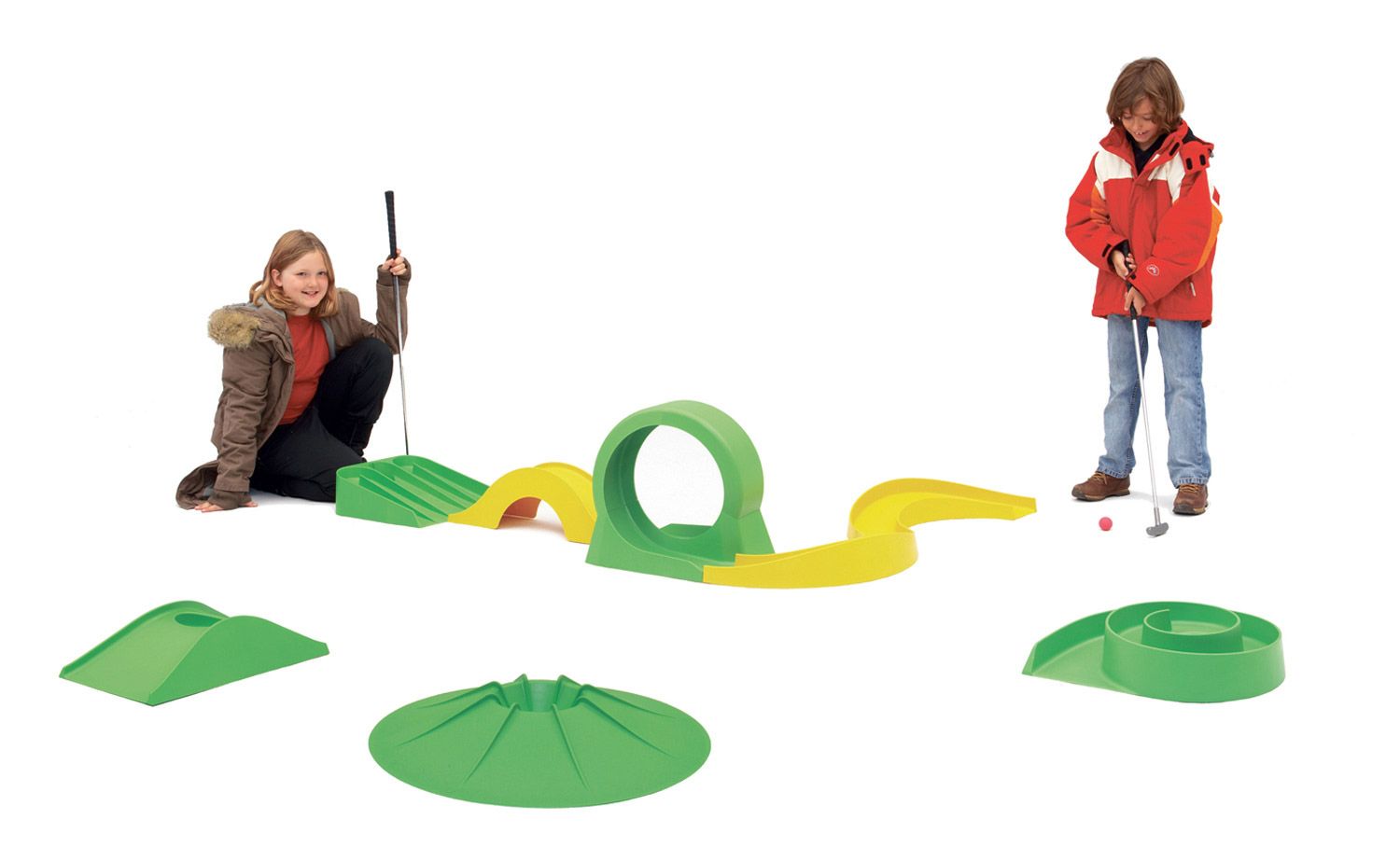 MyMinigolf PRO ist der erste Minigolfplatz zum überall hin mitnehmen. Die hochwertigen Kunststoffhindernisse in nahezu originaler Größe werden einfach auf den Boden gelegt und schon kann es losgehen. Als Crossover zwischen Golf und Minigolf wird das Spiel ohne feste Bahnen gespielt. Es kann auf jedem ebenen Untergrund gespielt werden wie zum Beispiel auf dem Rasen, auf dem Pausenhof, in der Turnhalle oder im Klassenzimmer. MyMinigolf fördert die motorischen Fähigkeiten, regt zur Bewegung an und fordert die Kreativität der Kinder, da aus den einzelnen Elementen neue Bahnen zusammengestellt werden können. Die Umgebung kann ebenfalls ins Spiel integriert werden, was zusätzlich Raum für eigene Ideen bietet.