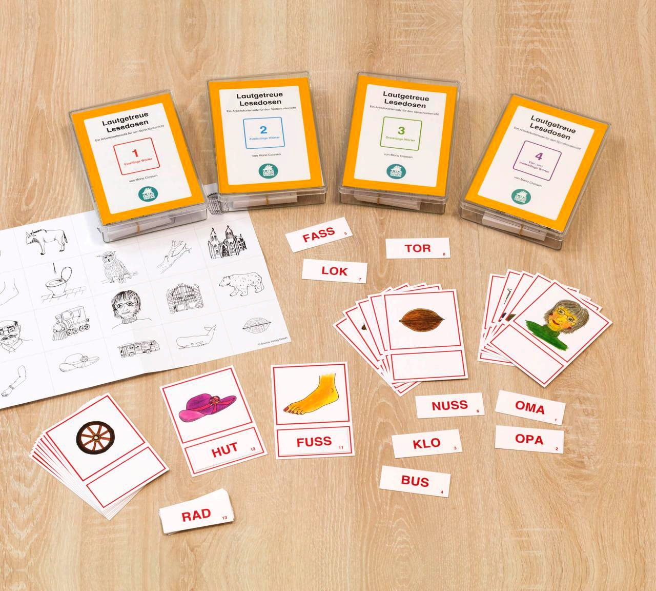 An diesen Schritten beim Prozess des Lesenlernens orientieren sich die „Lautgetreuen Lesedosen 1-4”. Jede Lesedose enthält 20 bunte Bildkarten mit den dazu passenden Wortkarten. Die Wortkarten sind beidseitig bedruckt: Auf der einen Seite in Groß- und Kleinbuchstaben, auf der anderen Seite nur in Großbuchstaben. Alle Wörter sind lautgetreu. Im Schwierigkeitsgrad bauen die 4 Lesedosen aufeinander auf: Dose 1 enthält einsilbige Wörter, Dose 2 zweisilbige, Dose 3 dreisilbige, Dose 4 vier- und mehrsilbige Wörter. Bild und passende Wortkarte haben zur Selbstkontrolle dieselbe Zahl.