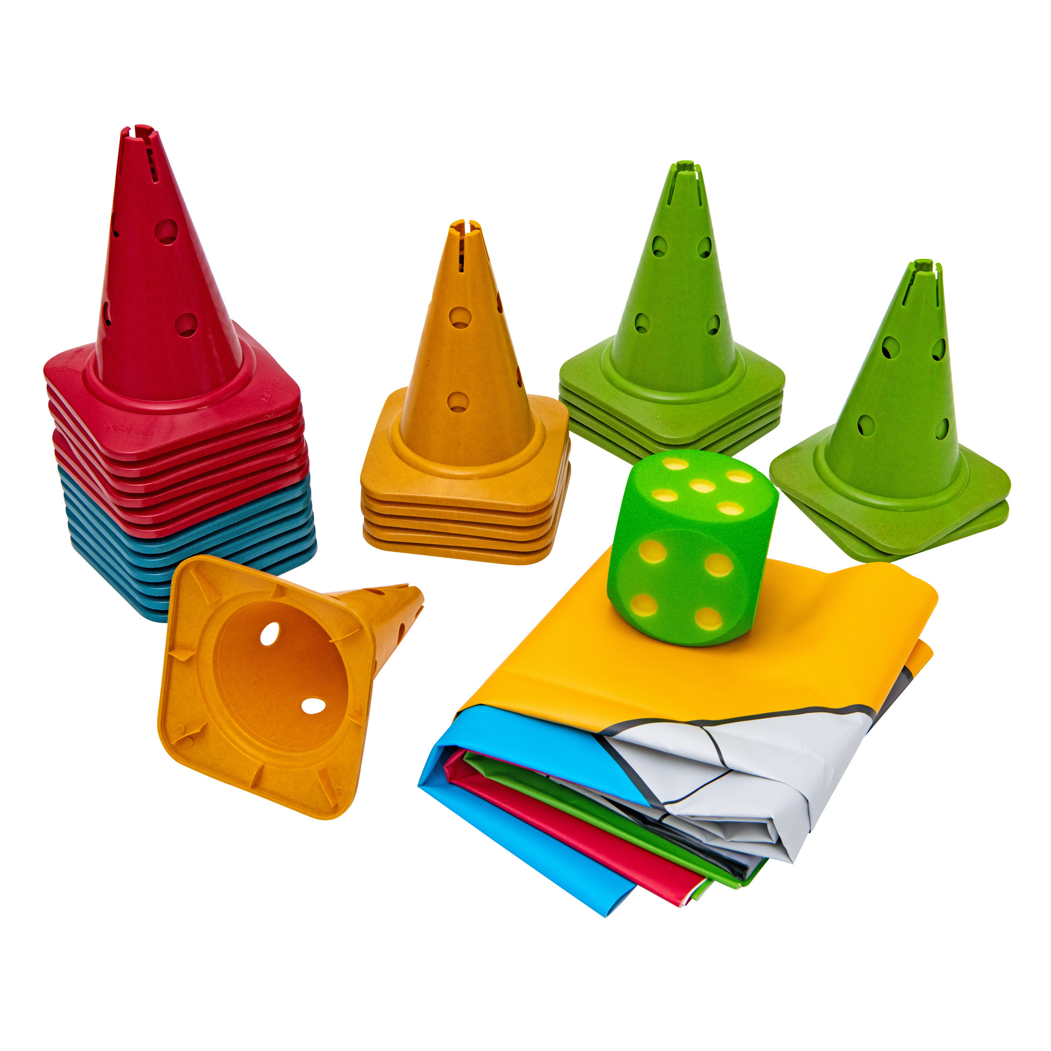 Lieferumfang: 1 XXL-Spielplane ( 2,7 x 2,7 m, 100% Polyester) 1 Schaumstoff-Spielwürfel (16 x 16 cm) 24 Kegel (6 x rot, 6 x blau, 6 x grün, 6 x gelb, 23 x 23 x 30 cm) 1 Spielanleitung 1 Aufbewahrungsbox (84L)