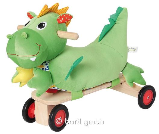Der niedliche Drache aus Polyesterfaser ist abnehmbar auf einem massiven Holz-Rollbrett befestigt. In den Ohren ist Knisterfolie und in der ersten Kammspitze ein kleiner Quietscher versteckt.