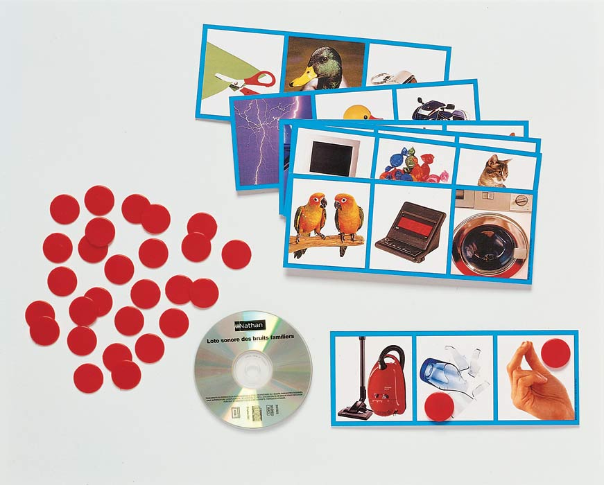12 Spieltafeln (25 x 9,5 cm) mit Fotos, Audio-CD mit 36 Geräuschen, 40 Spielchips, Anleitung