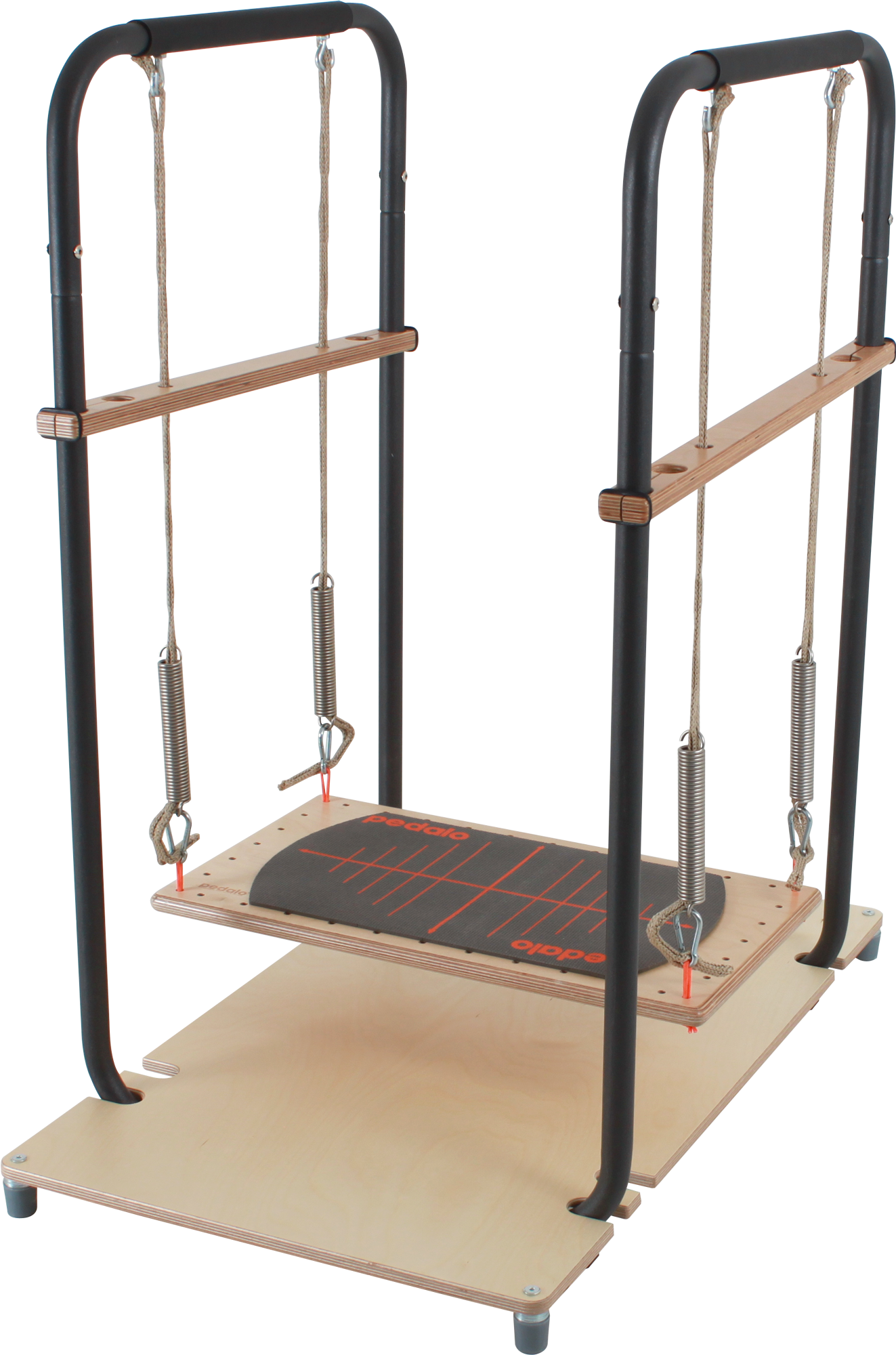 Bei der Ausführung Therapie kann sich der Übende an den hüfthohen Bügeln beidseitig festhalten. Die Standfläche wird an Seilen direkt (zweidimensionale Wirkung) oder in Verbindung mit Federn (dreidimensionale Wirkung) aufgehängt. Mit den seitlich an den Holmen angebrachten höhenverstellbaren Bewegungsbegrenzern wird der Bewegungsraum sowie die Schwingungsgeschwindigkeit eingestellt. Dadurch ist eine gute Anpassung an das Leistungsniveau jederzeit möglich. Optimale Wirkung im Einsatz bei Patienten mit neurologischen Ausfällen sowie bei Senioren zum Training des Gleichgewichts, der Standsicherheit und in der Sturzprävention.