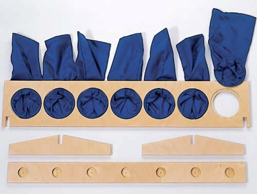 Holzständer aus lackiertem Schichtholz, einfach zusammensteckbar, 7 Fühlsäckchen aus Stoff Größe: Holzständer 74 x 30 x 14 cm