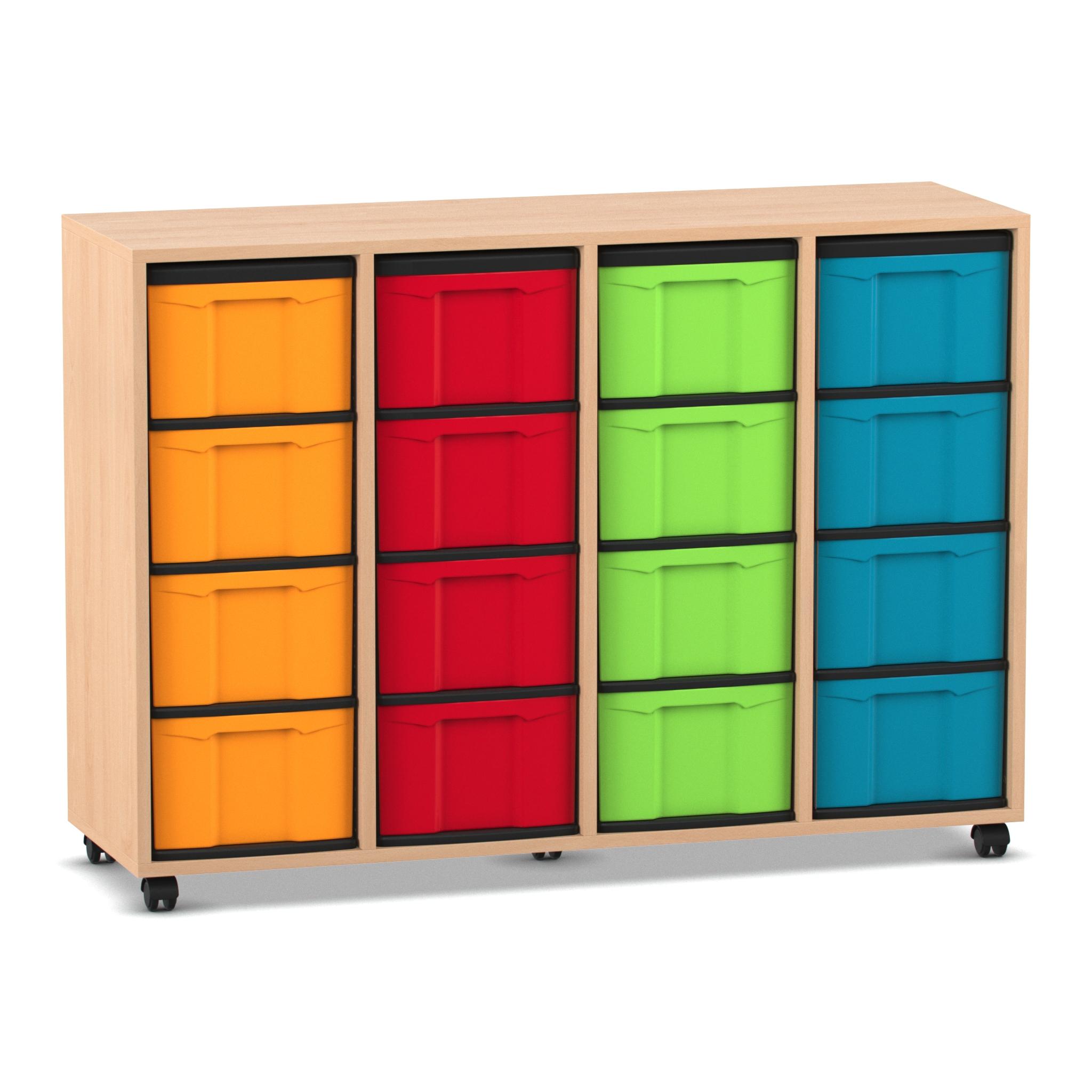 Flexeo Regal mit 4 Reihen, Dekor Buche hell, Stellfüße, 16 hohe Schubladen bunt, HxBxT: 92,3 x 130,7 x 40,8 cm