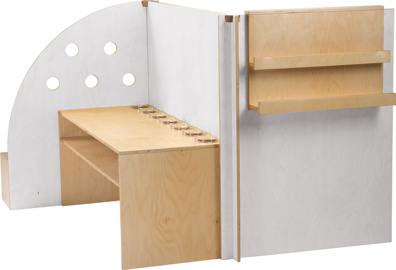 Die Krippenspielwände gliedern den Raum in geschützte und differenzierte (Spiel-) Bereiche. Die Wandhöhe von 1 m ermöglicht den Kindern ein konzentriertes und ausdauerndes Spiel, dennoch haben die Erwachsenen einen guten Ein- und Überblick. Die Krippenspielwände können werkzeuglos zusammen- bzw. auseinandergesteckt und leicht umgebaut werden. Die eine Seite/Raumnische bietet Platz für Krippenspielmöbel (Küchenzeile oder Wickelplatz), einen Verkaufsraum, ein Büro o.ä., die andere Seite lädt durch ein halbrundes Stufenpodest, einen Spiegel, inndem die Kinder ihren ganzen Körper sehen können, zu vielfältigen ersten Rollenspielen, Wahrnehmungserfahrungen und zum Ausprobieren ein.