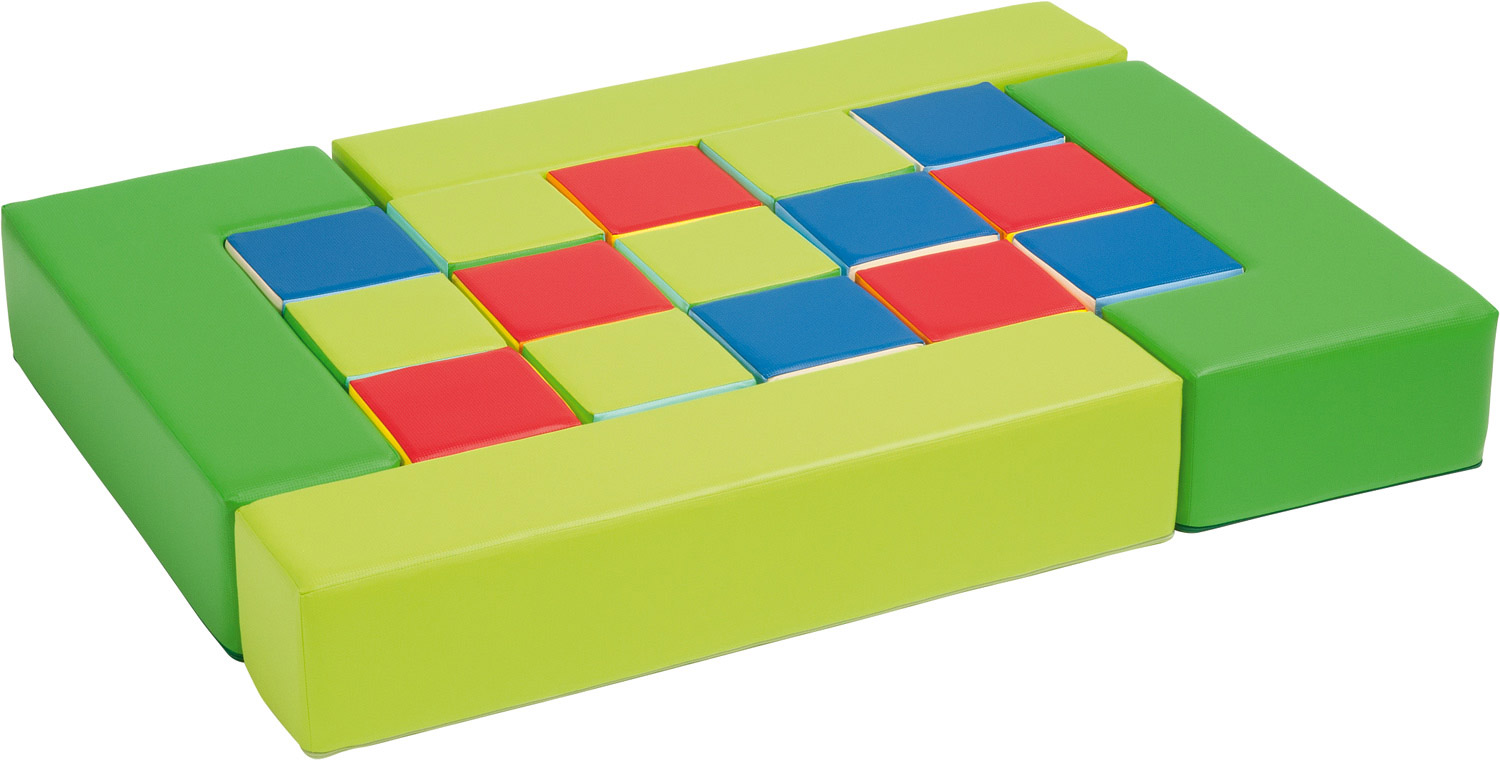 Ein Spielpolster-Set, konzipiert im Hause Dusyma, speziell für die Kleinsten. 15 Würfel in ansprechenden Farben laden zum Bauen und Sortieren ein. Die großen Seitenteile können zum Balancieren, Ausruhen oder Bauen verwendet werden. Die Kinder sind fasziniert von den Möglichkeiten. Jedes Teil ist leicht und kompakt. So können die Kinder spielerisch ihre Ideen selbst umsetzen. Am Ende des Spiels lässt sich alles wieder passend in den Rahmen einsortieren und wird zusammen mit dem Bezug zum Spiel- und Kuschelpolster oder zur Matratze aufgeräumt. Inhalt: 15 Würfel in je 3 verschiedenen Farben, 4 Rahmenteile, mit Klettpunkten verbunden, Bezug mit Reißverschluss und Griff.