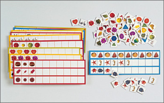 Auf großen farbigen Vorlagekarten sind Reihen angefangen, die es richtig zu ergänzen gilt.