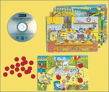 CD (54 Min. Spieldauer) mit 48 verschiedenen Geräuschen, in variierender Reihenfolge und Länge, 6 farbige Situationstafeln 33 x 22 cm, 50 Jetons, Anleitung.