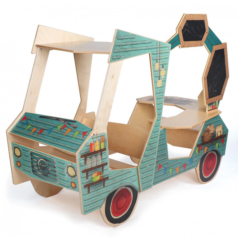 Was braucht man, um Geschmacksknospen zum explodieren zu bringen? Eigentlich nicht viel: Eine Idee, einen Truck, die Straße und unverschämt gut schmeckendes Essen. Foodtrucks sind auf dem gastronomischen Vormarsch und erobern uns im Handumdrehen. Unser ERZI Foodtruck lässt Kinderherzen höher schlagen. Im Fahrerhaus kann man mit Gangschaltung und Lenkrad entspannt übers Land cruisen, um dann in der nächsten Stadt seine Leckereien an den Mann oder die Frau zu bringen. Hinten im Foodtruck gibt es natürlich eine Grill- und Kochstelle, eine Verkaufstheke mit Verkaufsfenster und Ablageflächen für alle Snacks. Über und neben der Verkaufstheke befinden sich 2 Tafeln, auf denen die kleinen Köche ihr heutiges Menü anpreisen können.