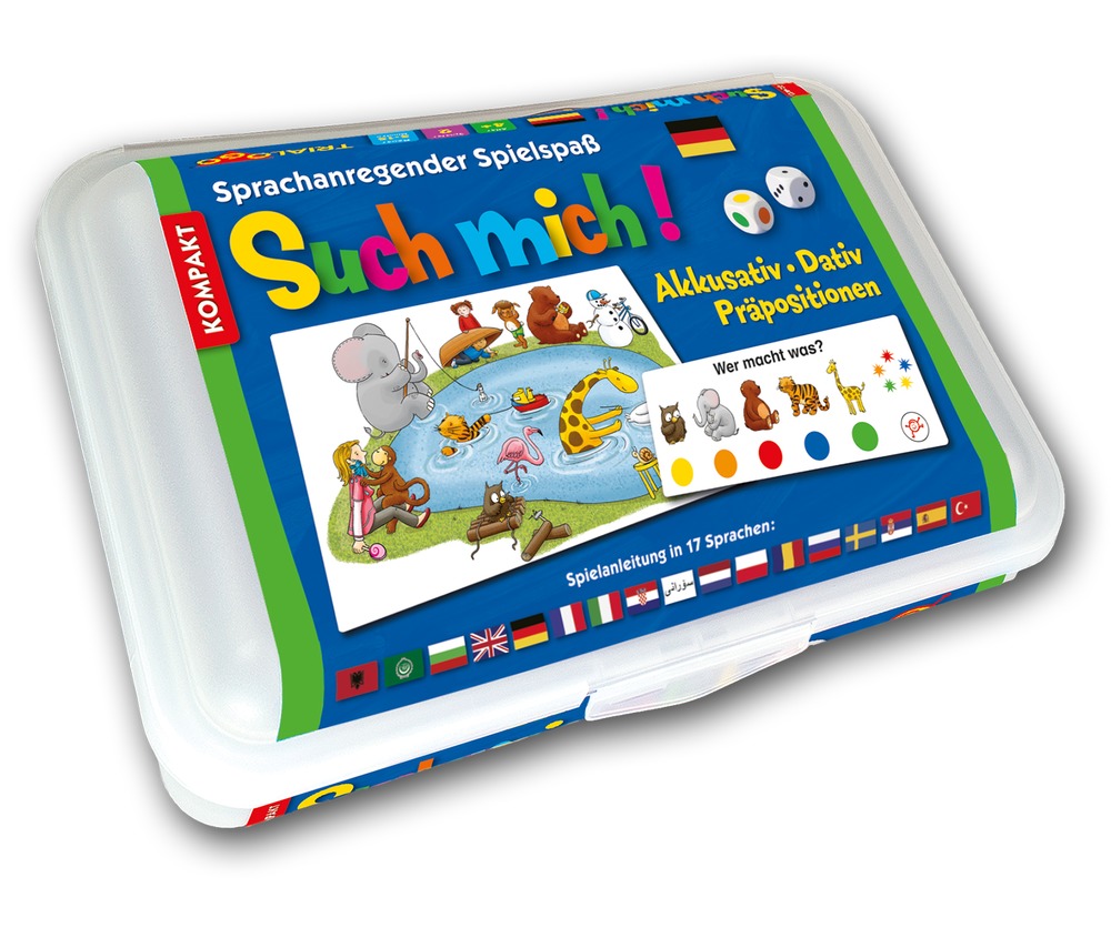 Die neuen Kompakt-Spiele von Trialogo: Die Kompaktspiele sind die ideale Lösung, wenn in einer Sprachtherapie erworbene Fähigkeiten zuhause und im Alltag geübt und eingesetzt werden sollen: Sie können das Spiel einfach ausleihen und mitgeben! Da die Förderung bei LRS und der Grammatik bei den Kompaktspielen im Vordergrund steht, eignen sie sich auch hervorragend für die spielerische Sprachförderung in Schule, Kita und Zuhause. Für Zuhause - 17 Sprachen 39 Prozent aller Kinder unter 5 Jahren kommen inzwischen aus Familien mit Migrationshintergrund. Oft ist es deshalb hilfreich, wenn sie oder ihre Eltern eine Spielanleitung in der Muttersprache zur Verfügung haben. Die Anleitungen der neuen Kompaktspiele wurden in sechzehn Sprachen übersetzt: Albanisch, Arabisch, Bulgarisch, Englisch, Französisch, Italienisch, Kroatisch, Kurdisch, Niederländisch, Polnisch, Rumänisch, Russisch, Schwedisch, Serbisch, Spanisch, Türkisch. Damit können Sie Ihren Kindern und deren Familien einen besonderen Service bieten! Das Original Such mich!-Spiel finden Sie unter der Artikelnummer T90040.