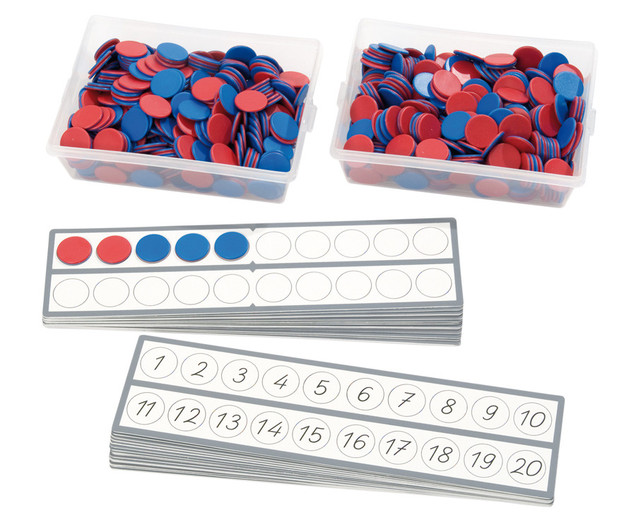- 30 Kunststoff-Rechenleisten, abriebfest bedruckt, eine Seite mit Kreisen und Zahlen, andere Seite ohne Zahlen - 800 Wendeplättchen rot/blau, Größe entspricht den Kreisen auf den Leisten. - Aufbewahrungsbox