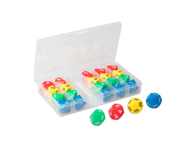 Die Stellenwert-Würfel eignen sich ideal, um Kindern das Dezimalsystem spielerisch näherzubringen. Ihre Schüler/innen erwürfeln Zahlen im 1000er-Bereich und lernen so die richtige Schreibweise. Die Farben der Würfel passen zum Zehnerbasissatz sowie zu den Systemblöcken. Die 24 Würfel kommen in einer praktischen Sortierbox.
