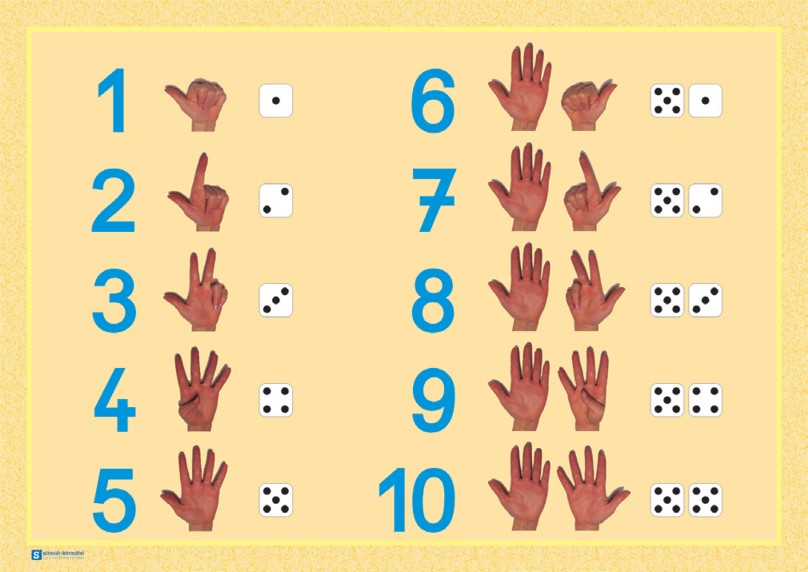 Poster mit Zahlenangabe, Hand- und Würfeldarstellungen für die Zahlen 1 bis 10.