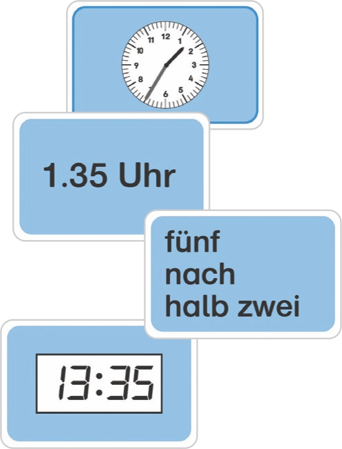 Mit den Spielen der Reihe „Wie spät ist es?“ werden unterschiedliche Sprech- und Darstellungsweisen zu Uhrzeiten trainiert. Es gibt 4 Spiele mit aufsteigendem Schwierigkeitsgrad. Die Uhr lesen zu können ist eine wichtige Fähigkeit, nicht nur im Schul- sondern auch im Lebensalltag. Eine Trainingsmöglichkeit dafür sind diese Kartenspiele, bei denen die Anforderungsstufen stark differenziert sind.
