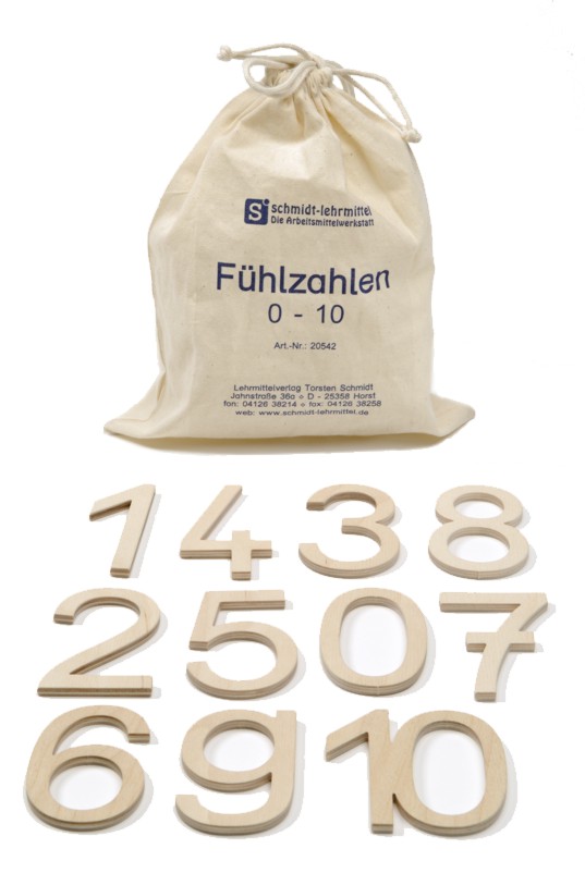 Fühlzahlen aus Holz, Schuldruckschrift, im Baumwollbeutel